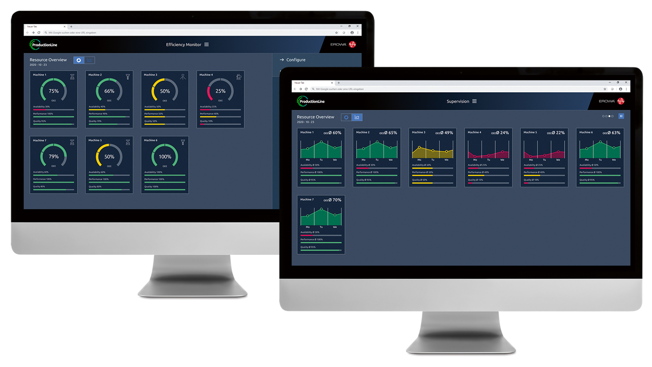 Integrated dashboard and supervision applications show key efficiency figures in real time as well as the current status of production cells.