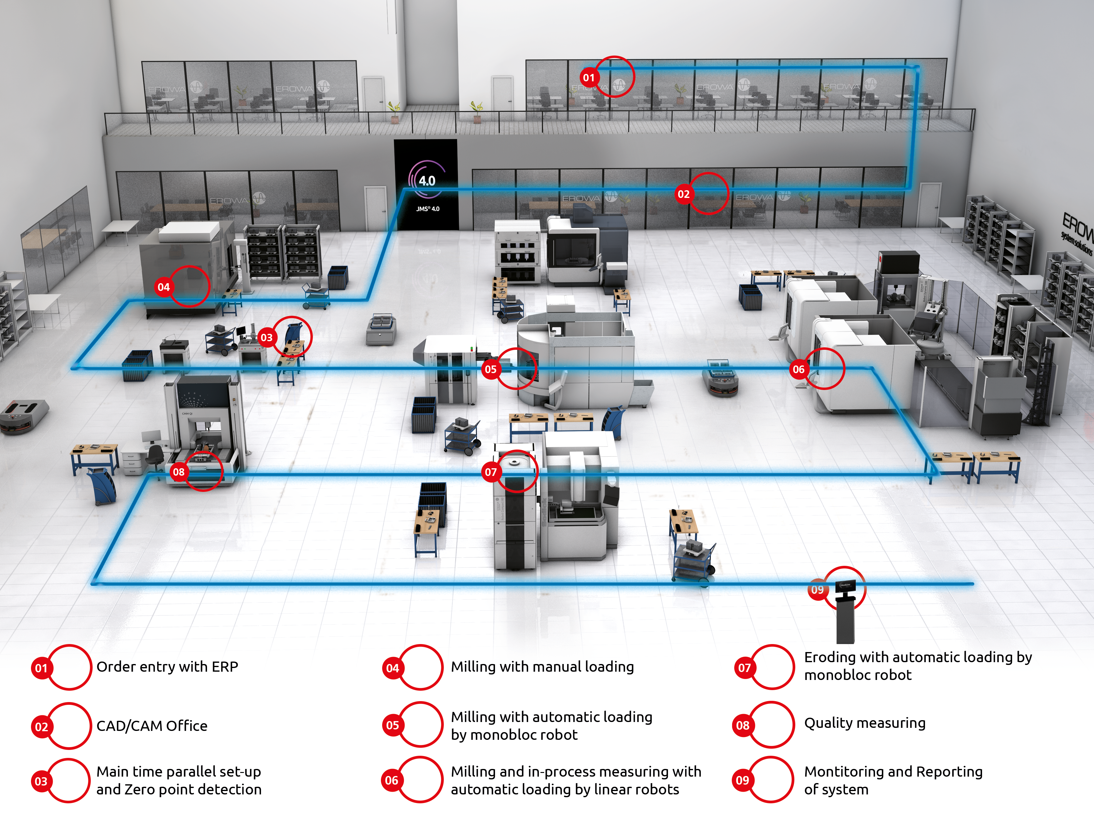 The EROWA JMS 4.0 process control system combines all data and controls the entire production process.
