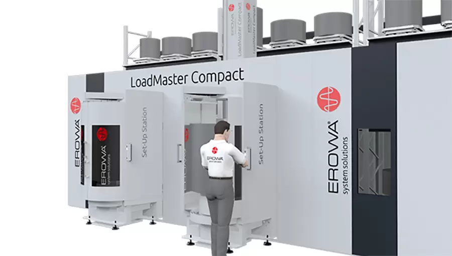 Walk-in or sliding door access. The set-up stations are integrated components of the LoadMaster production lines. Versions with lifting unit, with rotating and tilting table or with rotary table are available. All set-up positions are accessible with overhead crane.