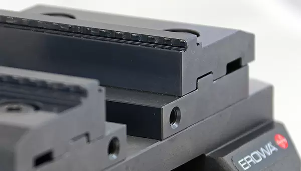 The new EROWA blank vise safely clamps workpieces with a high degree of clamping power at minimum height. The vise is characterized by a compact and robust, but still lightweight design. The individually usable jaws enable a wide variety of workpiece sizes to be clamped.