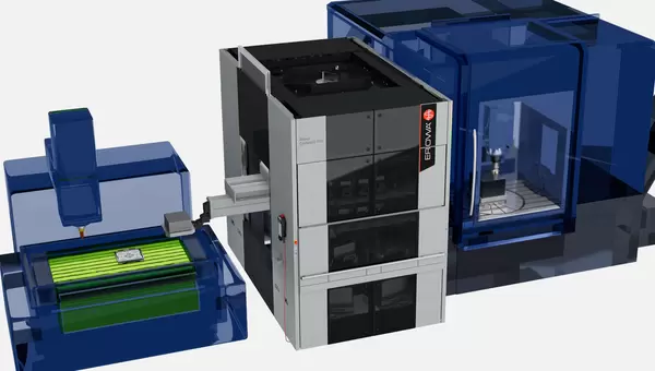 Une cellule de production autonome et flexible. Avec un encombrement réduit, le robot EROWA Compact 150 charge un centre de fraisage et une machine d'électroérosion par enfonçage.