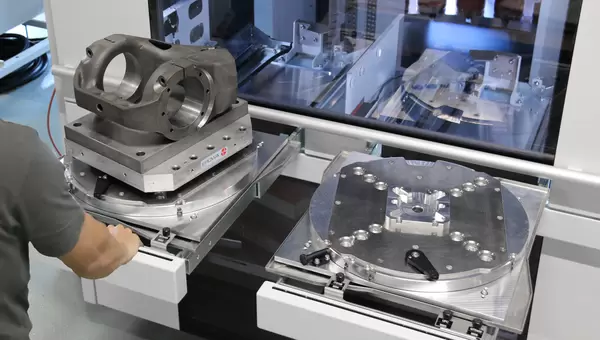Même les grandes palettes EROWA MTS 400 avec un poids de transfert allant jusqu'à 150 kg et une hauteur de pièce allant jusqu'à 400 mm sont chargées avec précision sur la machine.